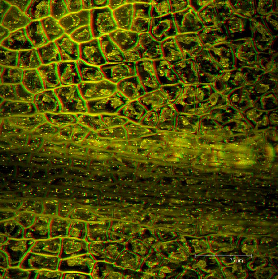 3D Stereo transparent projection of a series scan of Dwarf Umbrella plant leaf (Schefflera arboricola).