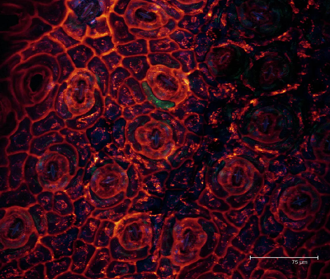 Overview Creator: Langsdale, Hannah Subject: Description:Maximum projection of Dwarf Umbrella Tree leaf (Schefflera arboricola). Stomata and vasculature shown in glow. Guard cells shown in green. Secondary compounds shown in blue. Total depth of section = 21.17µm Date Original:2013, April 29 Language:eng Rights Rights Management:Original materials may be protected by the Copyright Law of the United States (more information). Technical Digitization Specifications:Saved as JPEG (level 12) in Photoshop CS6 Date Digital:Tue, 02/03/2015 - 20:00 Format:image/jpeg Type:Image