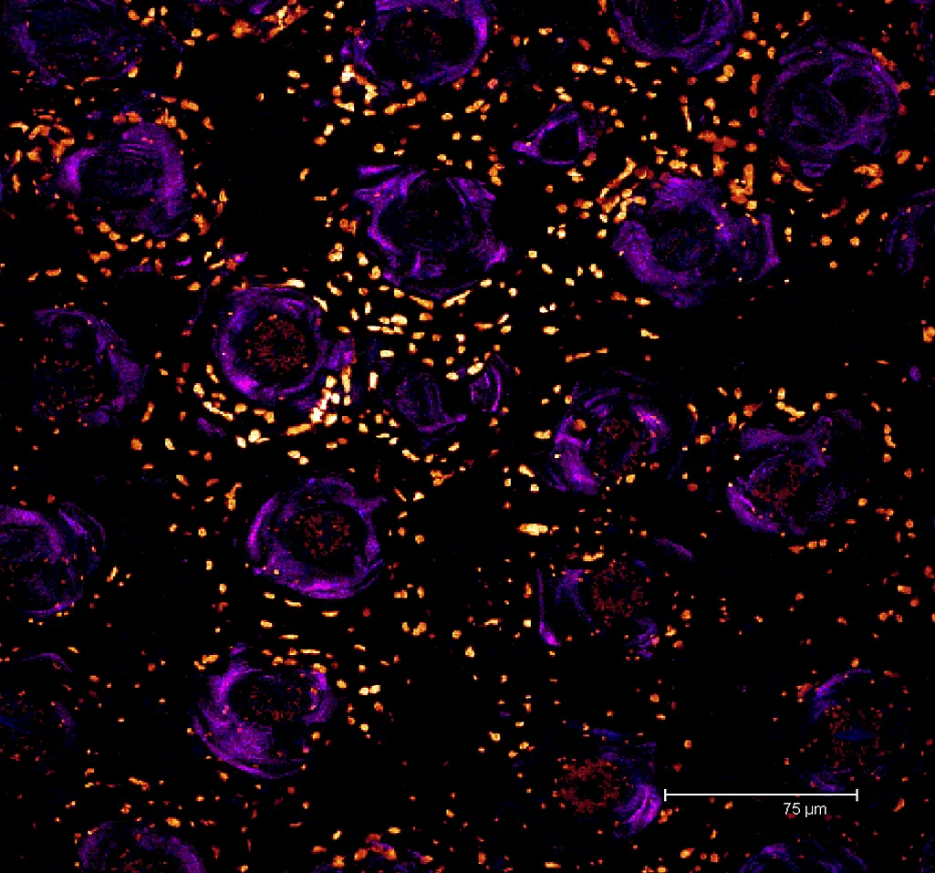 Average image of a Dwarf Umbrella tree (Schefflera arboricola) leaf. Total depth 36.52um. Chloroplast in glow, guard cells in magenta, unknown in red