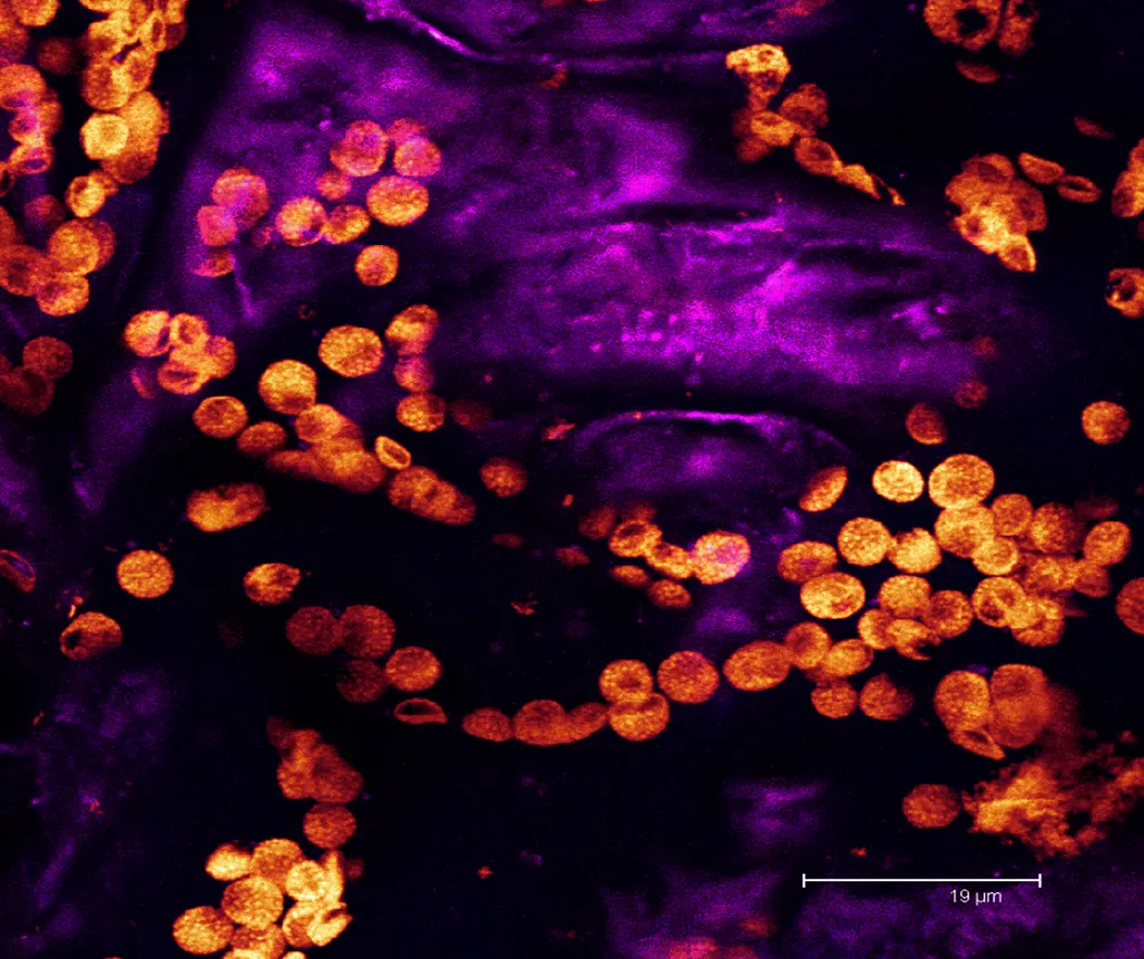 Overview Creator: LeValley, Kristy Subject: Description:Max image of a Dwarf Umbrella tree (Schefflera arboricola) leaf. Total depth 11.32um. Chloroplasts in glow, waxes in magenta Date Original:2013, February 23 Language:eng Rights Rights Management:Original materials may be protected by the Copyright Law of the United States (more information). Technical Digitization Specifications:Saved as JPEG (level 12) in Photoshop CS6 Date Digital:Wed, 02/04/2015 - 20:00 Format:image/jpeg Type:Image