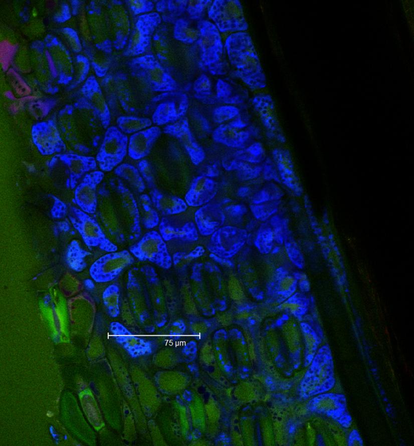 Auto-Fluorescence. Guard cells in green, epidermal cells in blue and sugars in red.