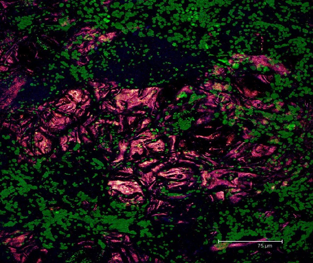 Average image of Echeveria (succulent) leaf. Total depth 21.17um. Chloroplast in green, epidermal cells in glow, water/sugars in blue