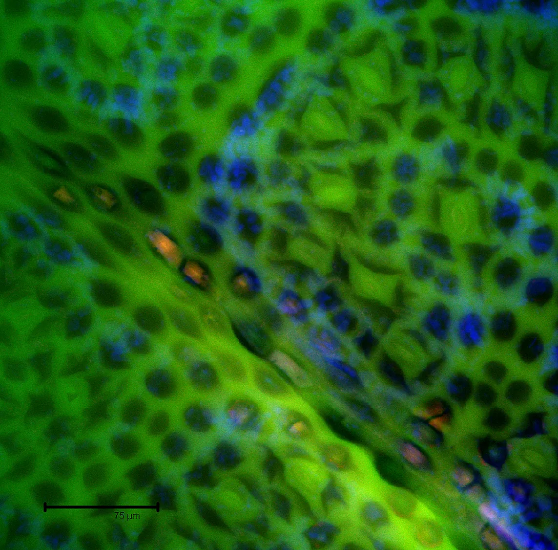 Epidermis shown in green, mesophyll in blue, parenchyma tissue in glow