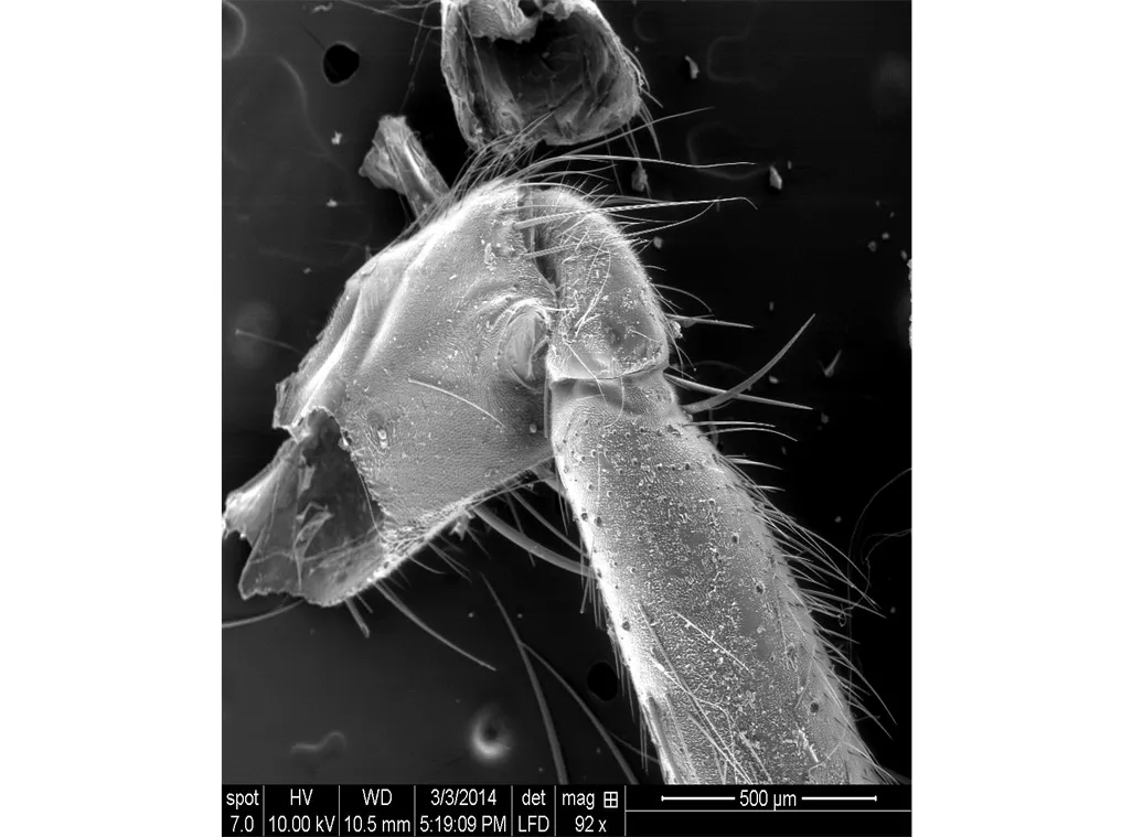 Overview Creator: Caramia, Sierra Subject: Description:Sample of a fly leg; 10.00 kV, spot size 7; low vacuum, secondary electron Date Original:2014, March 3 Language:eng Rights Rights Management:Original materials may be protected by the Copyright Law of the United States (more information). Technical Digitization Specifications:Saved as JPEG (level 12) in Photoshop CS6 Date Digital:Tue, 01/20/2015 - 20:00 Format:image/jpeg Type:Image