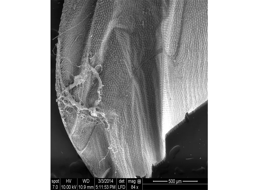 Overview Creator: Caramia, Sierra Subject: Description:Fly wing with dust and cob web particles; 10.00 kV, spot size 7; low vacuum, secondary electron Date Original:2014, March 3 Language:eng Rights Rights Management:Original materials may be protected by the Copyright Law of the United States (more information). Technical Digitization Specifications:Saved as JPEG (level 12) in Photoshop CS6 Date Digital:Tue, 01/20/2015 - 20:00 Format:image/jpeg Type:Image