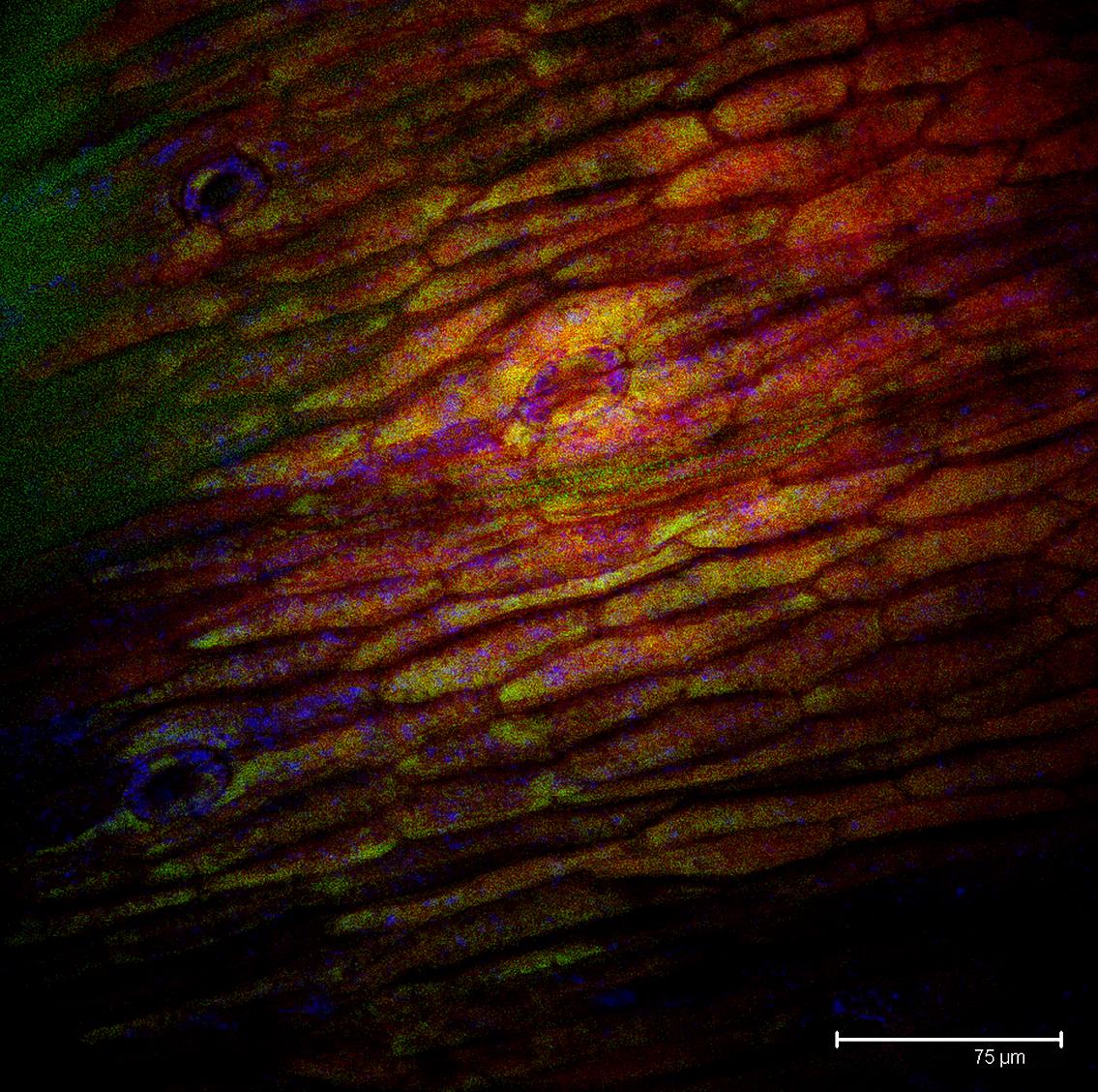 Overview Creator: Reid, Brittany Subject: Description:Series scan of a Gebera Daisy (Gerbera jamesonii). Depth of section 41.52 μm. Average image with brightness/ contrast processing. Phloem shown in green and chloroplasts shown in blue. 3.26.2013 Brittany Reid Date Original:2013, March 26 Language:eng Rights Rights Management:Original materials may be protected by the Copyright Law of the United States (more information). Technical Digitization Specifications:Saved as JPEG (level 12) in Photoshop CS6 Date Digital:Wed, 02/04/2015 - 20:00 Format:image/jpeg Type:Image