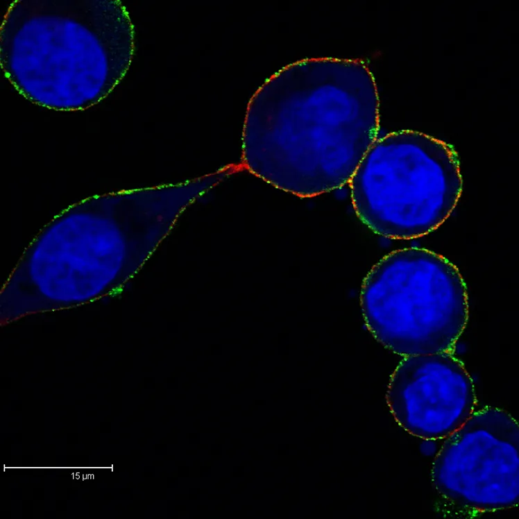 HELA Cells Coverslip, Nuclei were labeled with Draq-5 and are Blue, while F-Actin Filaments were labeled with Phalloidin and are green. Microtubule associated proteins are represented by red. Zoom=2.00