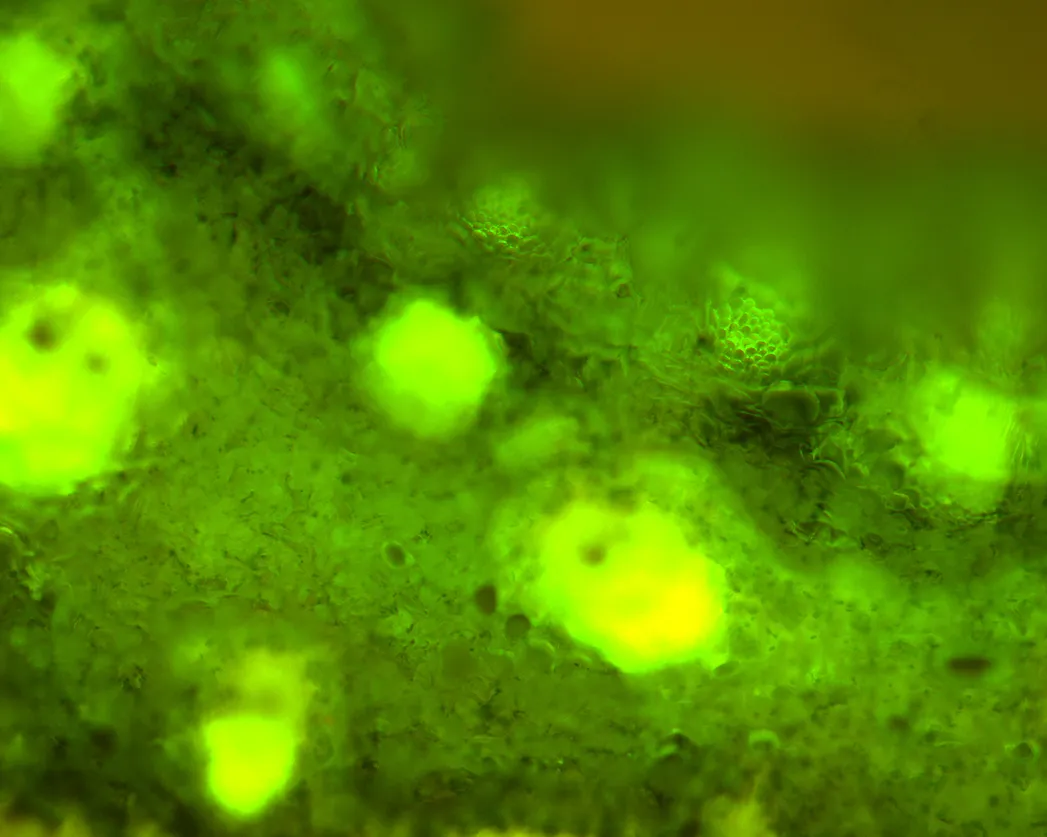 A cuticle of the leaf viewed under the 40x objective on the fluorescence microscope.