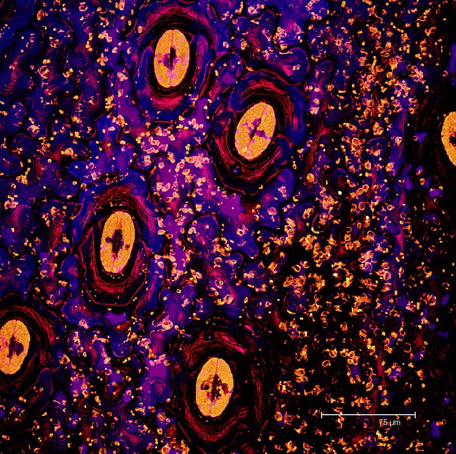 Overview Creator: Weis, Connor Subject: Description:Transparent projection of a series scan of a Maidenhern fern leaflet (Adiantum). Guard cells shown in red, stomata shown in glow 27.77 µm section Date Original:2013, May 2 Language:eng Rights Rights Management:Original materials may be protected by the Copyright Law of the United States (more information). Technical Digitization Specifications:Saved as JPEG (level 12) in Photoshop CS6 Date Digital:Sun, 02/08/2015 - 20:00 Format:image/jpeg Type:Image