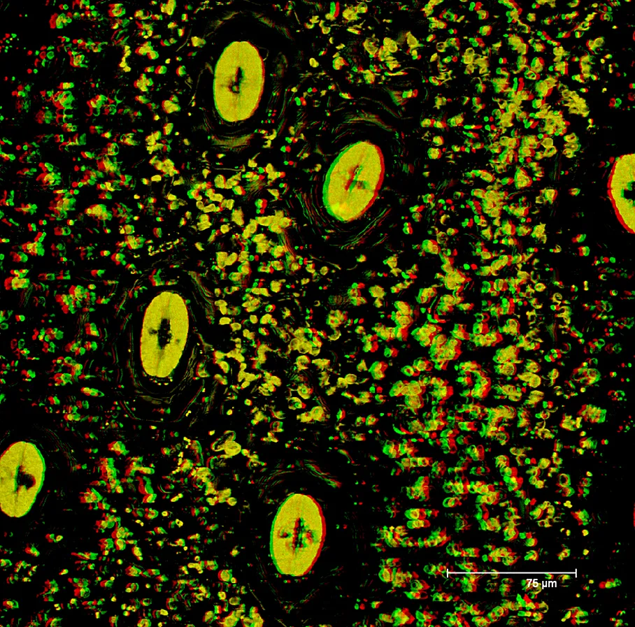 3D Stereo transparent projection of a series scan of a Maidenhern fern leaflet (Adiantum). Depth Factor of 3.