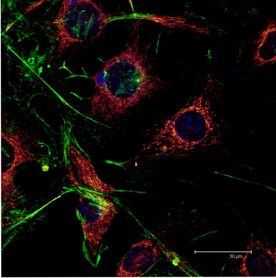Overview Creator: Monhart, Matt Subject: Description:Maximum projection image of B16 cells. Nuclei stained with Draq-5 (blue), mitochondria stained with mitotracker (Glow) and F-actin filaments with Phallodin (Green). Depth of section 1.14 µm. Date Original:2014, November 6 Language:eng Rights Rights Management:Original materials may be protected by the Copyright Law of the United States (more information). Technical Digitization Specifications:Saved as JPEG (level 12) in Photoshop CS6 Date Digital:Mon, 01/26/2015 - 20:00 Format:image/jpeg Type:Image