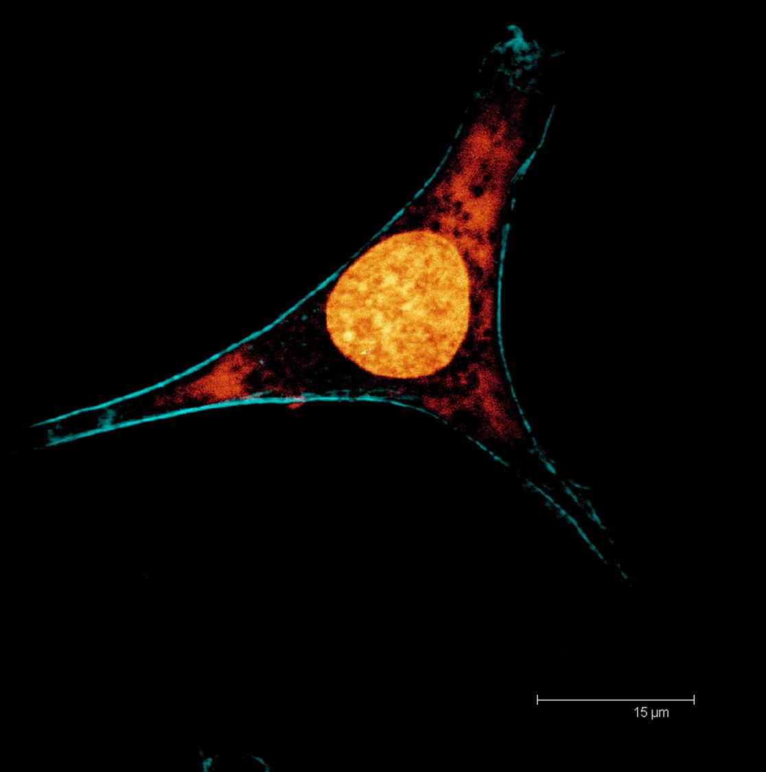 Overview Creator: Monhart, Matt Subject: Description:Maximum projection image of Ht-22 cells. F-actin filaments stained with Phallodin (cyan) and Nuclei with Draq-5 (glow). Depth of section 2.56 µm. Zoom of 2.0. Date Original:2014, December 1 Language:eng Rights Rights Management:Original materials may be protected by the Copyright Law of the United States (more information). Technical Digitization Specifications:Saved as JPEG (level 12) in Photoshop CS6 Date Digital:Mon, 01/26/2015 - 20:00 Format:image/jpeg Type:Image