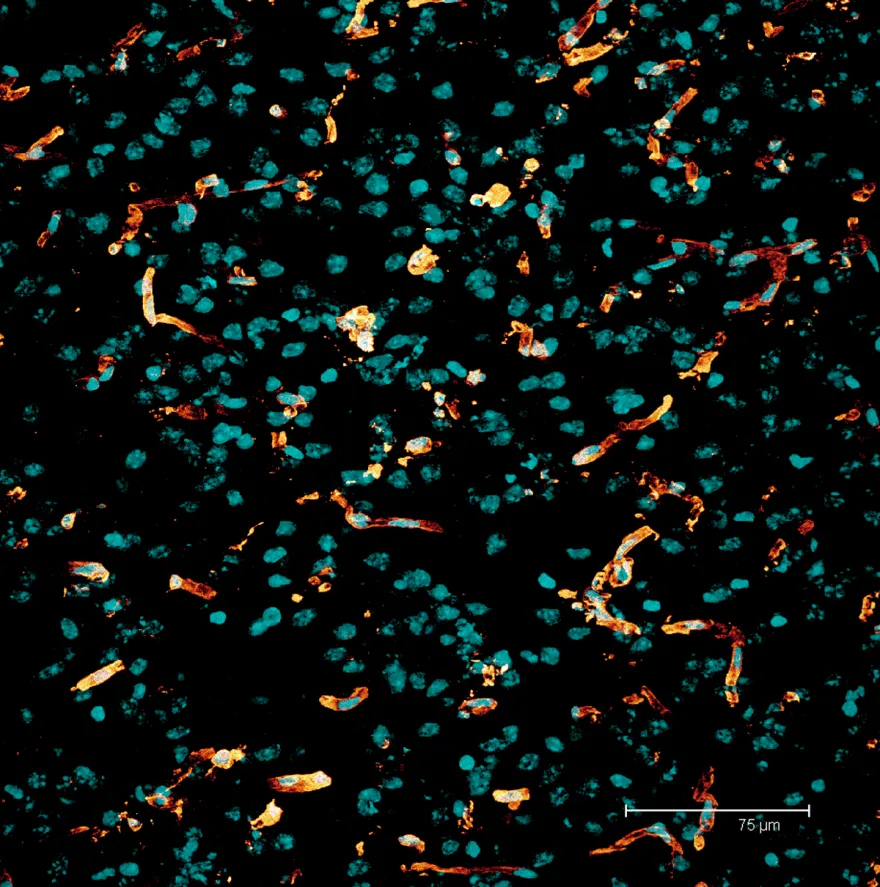 Overview Creator: Monhart, Matt Subject: Description:Maximum projection image of a rat brain section. Nuclei stained with Draq-5 (cyan). Vasculature stained with anti-laminin (glow). Depth of section 12.21 µm. Date Original:2014, November 10 Language:eng Rights Rights Management:Original materials may be protected by the Copyright Law of the United States (more information). Technical Digitization Specifications:Saved as JPEG (level 12) in Photoshop CS6 Date Digital:Tue, 01/27/2015 - 20:00 Format:image/jpeg Type:Image