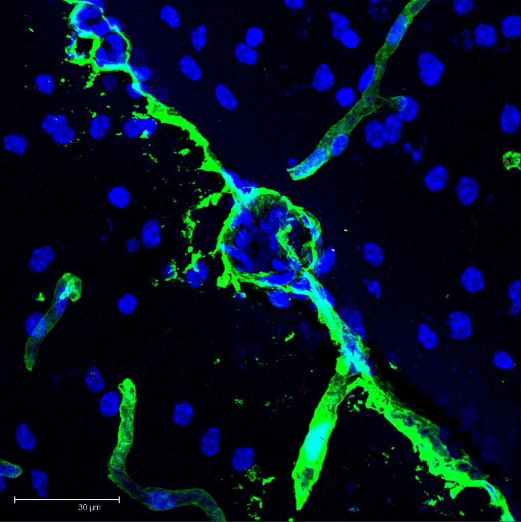 Maximum projection of a rat brain section. Nuclei represented in blue, lamina represented in green