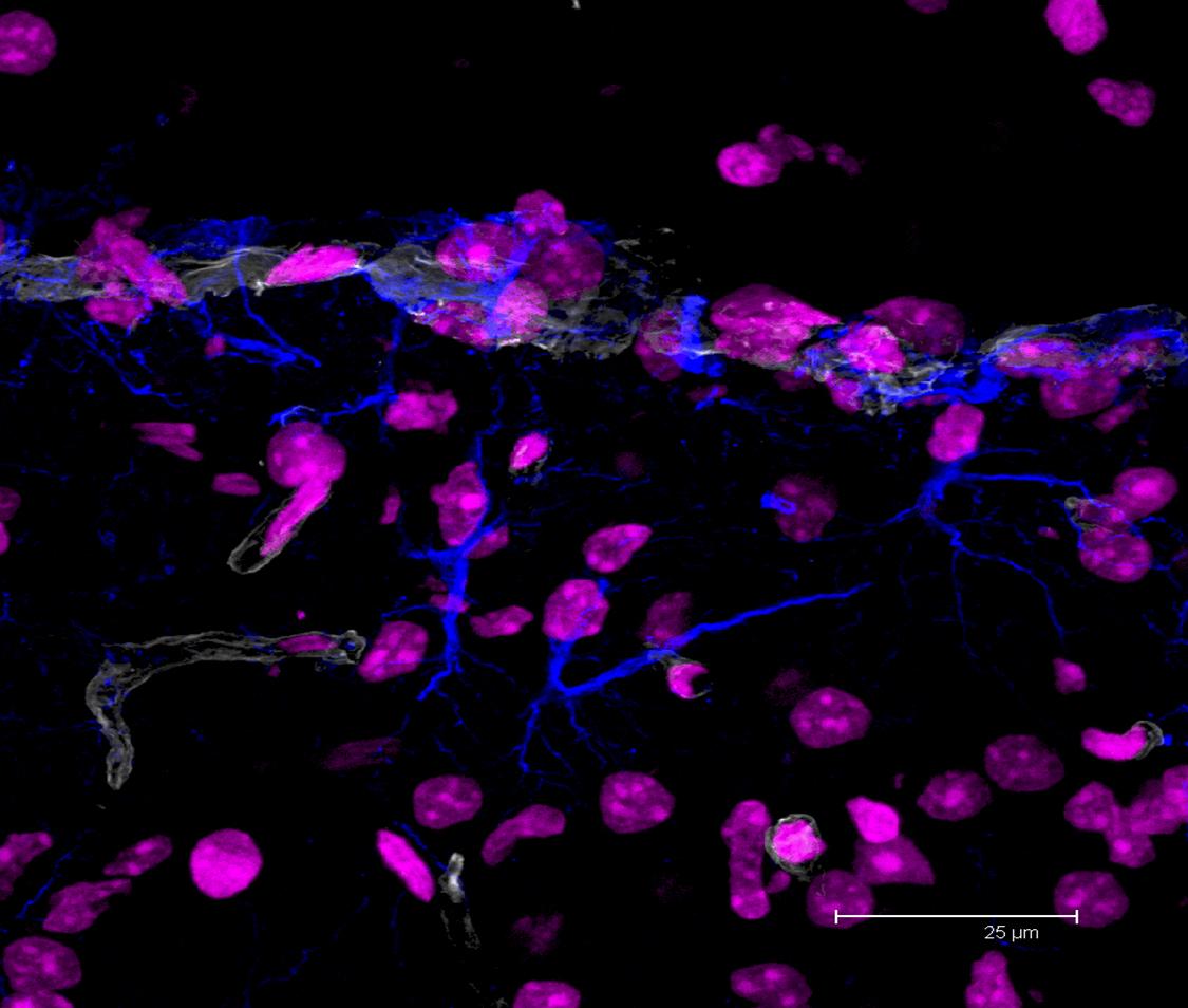 Overview Creator: Provost, Mark Subject: Description:Maximum projection of series scan of rat brain section. Nuclei in magenta, laminin in grey, glial fibrillary acidic proteins in blue. Scan Depth: 15.06 um Zoom: 3.00 Date Original:2014, October 31 Language:eng Rights Rights Management:Original materials may be protected by the Copyright Law of the United States (more information). Technical Digitization Specifications:Saved as JPEG (level 12) in Photoshop CS6 Date Digital:Wed, 01/28/2015 - 20:00 Format:image/jpeg Type:Image