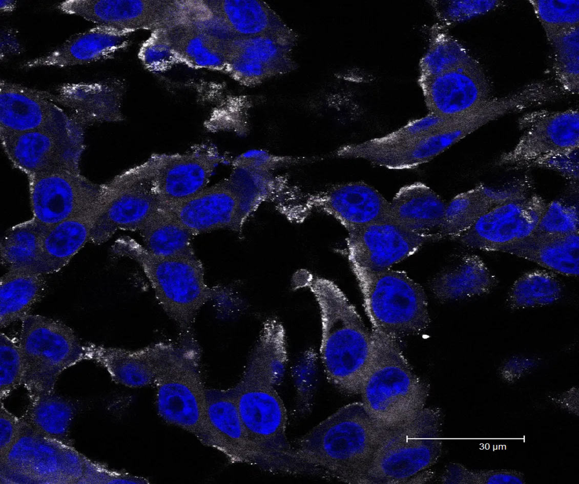 Overview Creator: Provost, Mark Subject: Description:Maximum projection of series scan of B16 cells. Nuclei are in blue and tubulin are in grey. Scan depth: 6.84um, Zoom: 1.81 Date Original:2014, November 18 Language:eng Rights Rights Management:Original materials may be protected by the Copyright Law of the United States (more information). Technical Digitization Specifications:Saved as JPEG (level 12) in Photoshop CS6 Date Digital:Tue, 01/27/2015 - 20:00 Format:image/jpeg Type:Image