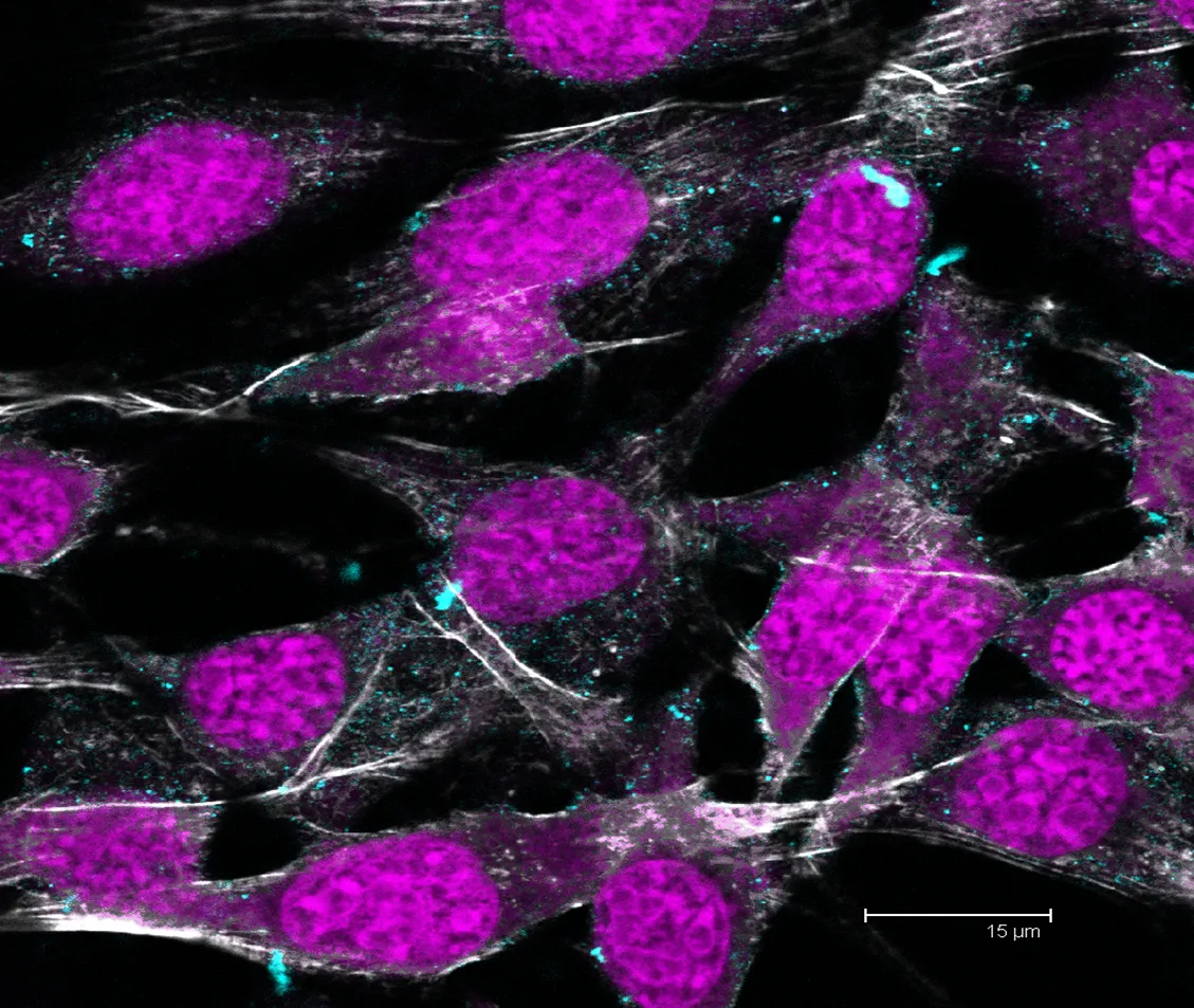 Overview Creator: Provost, Mark Subject: Description:Maximum projection of series scan of B16 cells. Nuclei are in magenta, F-actin filaments are in grey, microtubule associated proteins are in cyan. Scan Depth: 3.67 um Zoom: 1.71 Date Original:2014, December 8 Language:eng Rights Rights Management:Original materials may be protected by the Copyright Law of the United States (more information). Technical Digitization Specifications:Saved as JPEG (level 12) in Photoshop CS6 Date Digital:Tue, 01/27/2015 - 20:00 Format:image/jpeg Type:Image