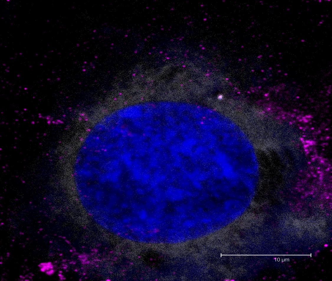 Maximum projection of series scan of B16 cell. Nucleus is in blue, F-actin filaments are in grey and microtubule associated proteins are in magenta.