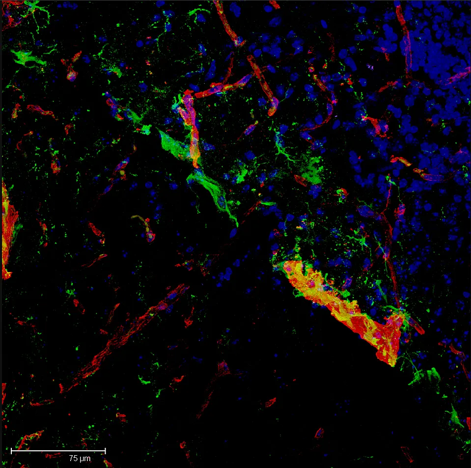 Overview Creator: Nowack, Cam Subject: Description:Transparent projection of a thick section of mouse brain. Glia shown in green, Nuclei in blue, vasculature in red. Depth of section = 21.34 μm Date Original:2013, April 4 Language:eng Rights Rights Management:Original materials may be protected by the Copyright Law of the United States (more information). Technical Digitization Specifications:Saved as JPEG (level 12) in Photoshop CS6 Date Digital:Wed, 02/04/2015 - 20:00 Format:image/jpeg Type:Image