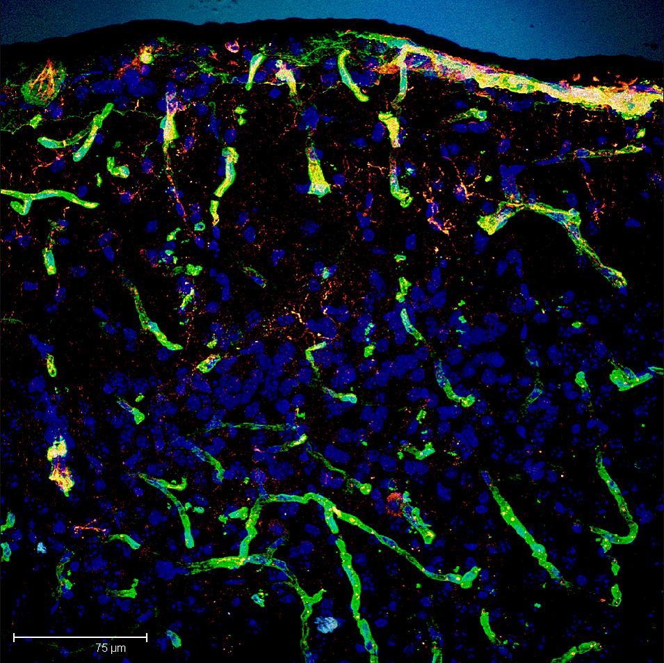 Overview Creator: Nowack, Cam Subject: Description:Transparent projection of a thick section of mouse brain. Gliashown in glow, Nuclei in blue, vasculature in green. Depth of section = 23.90 μm Date Original:2013, April 4 Language:eng Rights Rights Management:Original materials may be protected by the Copyright Law of the United States (more information). Technical Digitization Specifications:Saved as JPEG (level 12) in Photoshop CS6 Date Digital:Wed, 02/04/2015 - 20:00 Format:image/jpeg Type:Image
