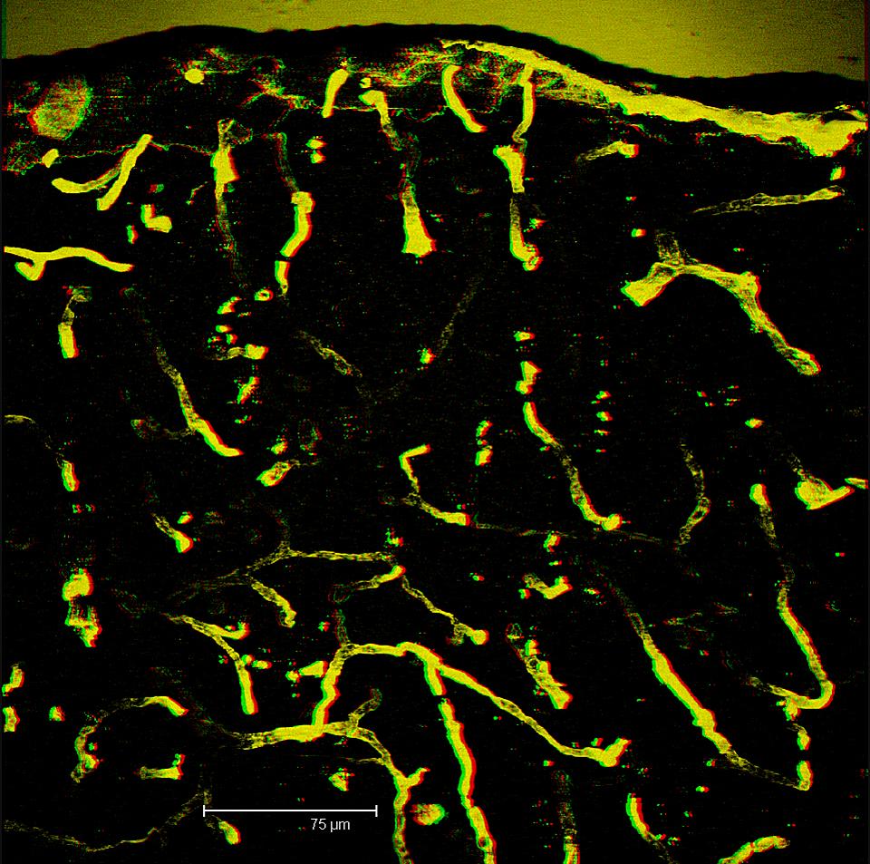 3D transparent projection of a thick section of mouse brain vasculature. Depth of section = 23.90 μm Depth factor 3