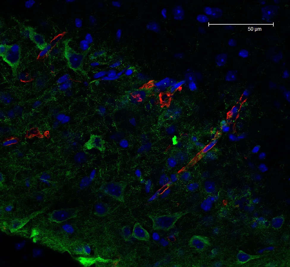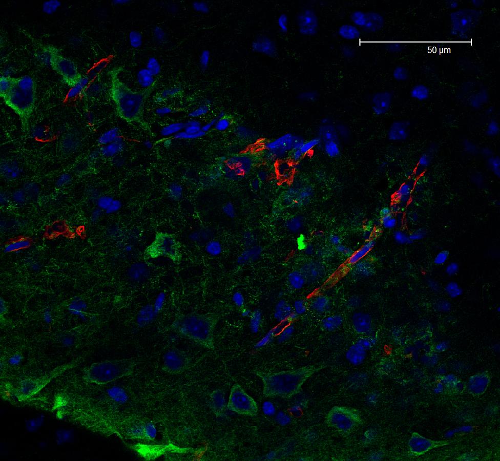 Overview Creator: Studlack, Paige Subject: Description:Single scan of a mouse brain section. Zoom = 2.0x Nuclei in blue, blood vessels in red, and neurofilaments in green. Date Original:2013, April 30 Language:eng Rights Rights Management:Original materials may be protected by the Copyright Law of the United States (more information). Technical Digitization Specifications:Saved as JPEG (level 12) in Photoshop CS6 Date Digital:Thu, 02/05/2015 - 20:00 Format:image/jpeg Type:Image