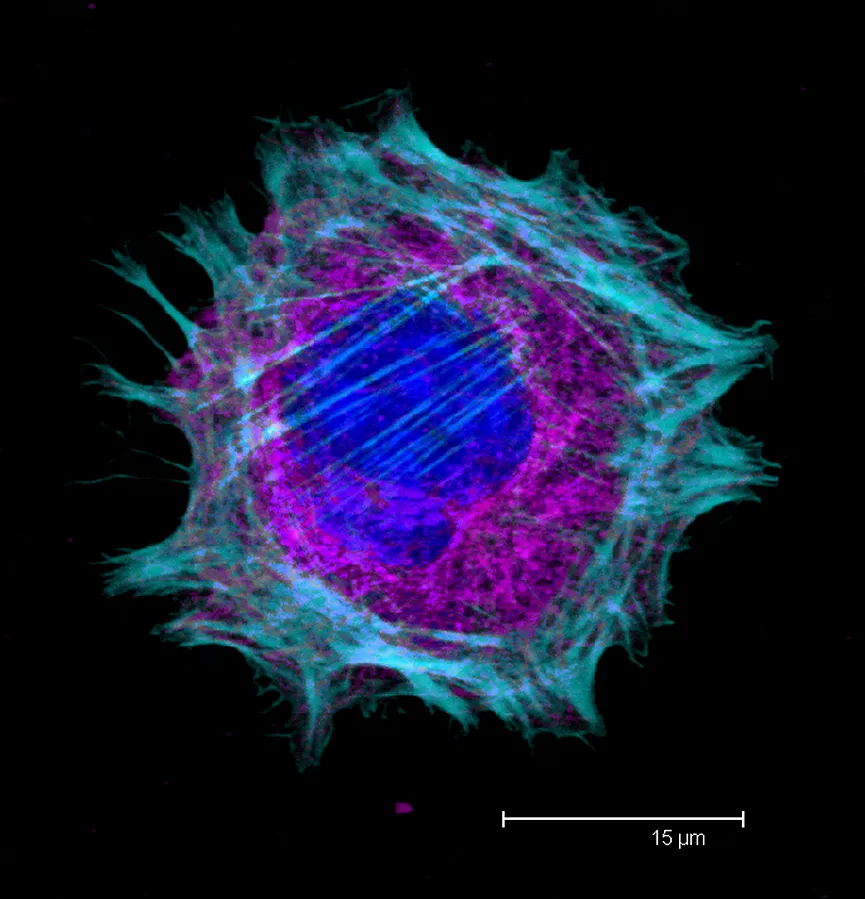 Overview Creator: Clauss, Jenny Subject: Description:Murine B16 Cells; Average projection of a series scan with total depth of section of 2.85 µm; F-actin filaments are shown in cyan, nuclei are shown in blue, and alpha-tubulin is shown in magenta; Zoom = 2 Date Original:2013, April 8 Language:eng Rights Rights Management:Original materials may be protected by the Copyright Law of the United States (more information). Technical Digitization Specifications:Saved as JPEG (level 12) in Photoshop CS6 Date Digital:Mon, 02/02/2015 - 20:00 Format:image/jpeg Type:Image