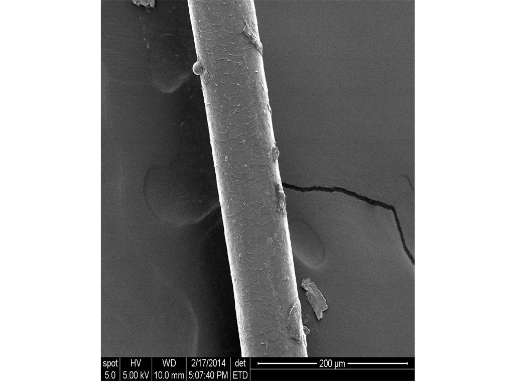 Overview Creator: Caramia, Sierra Subject: Description:Sample of Sierra Caramia’s hair; 5.00 kV, spot size 5; high vacuum, secondary electron Date Original:2014, February 17 Language:eng Rights Rights Management:Original materials may be protected by the Copyright Law of the United States (more information). Technical Digitization Specifications:Saved as JPEG (level 12) in Photoshop CS6 Date Digital:Tue, 01/20/2015 - 20:00 Format:image/jpeg Type:Image