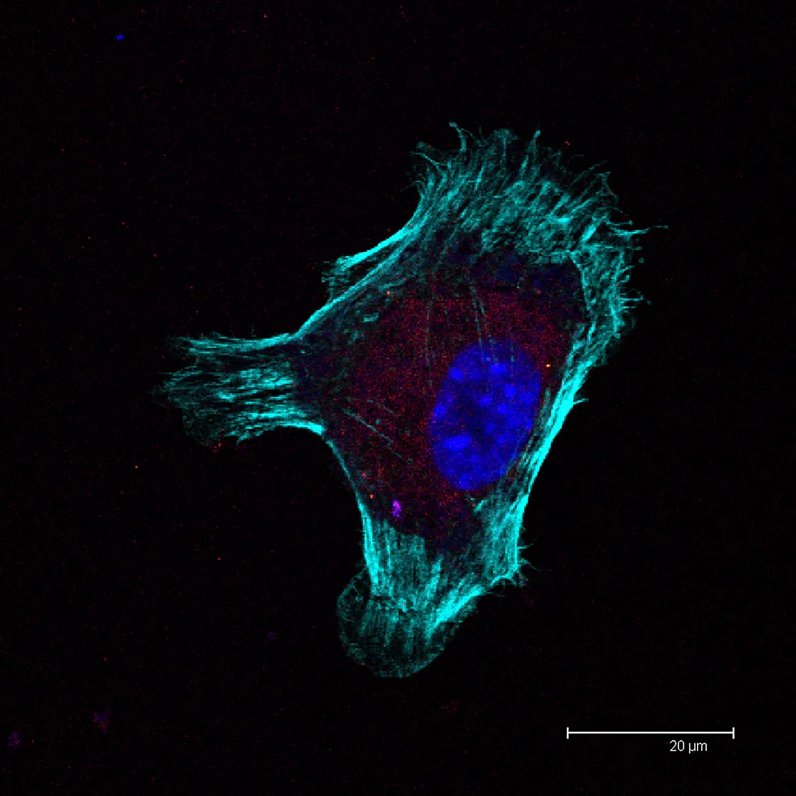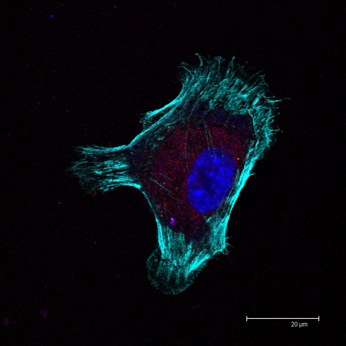 NIH 3T3 cell imaged on 4/9/12. Golgi bodies in glow, F-actin filaments in cyan, and nucleus in blue. Zoom was 2.5.