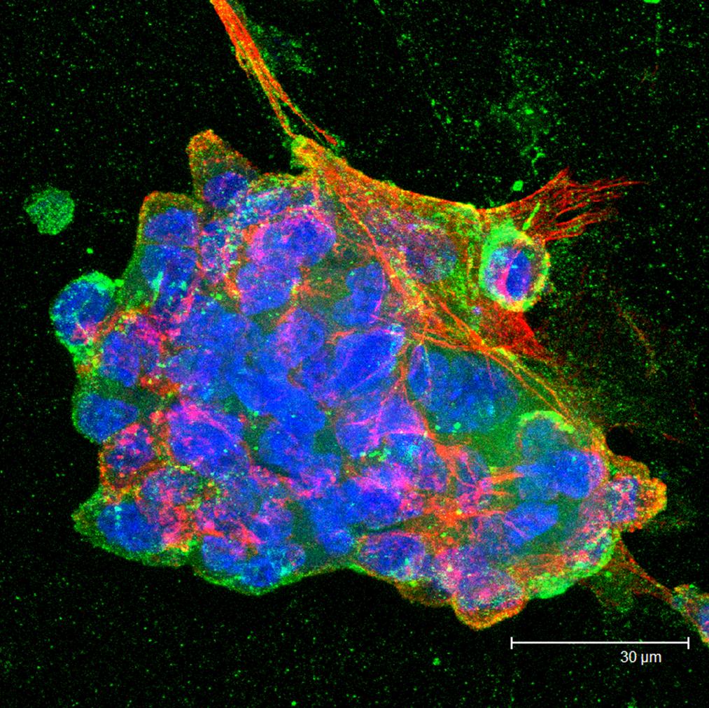 Overview Creator: Moon, Taylor Subject: Description:Max Image from a series scan. Depth of section 6.56 µm. Nuclei are stained in blue, f-actin filaments in red and microtubule associated proteins in green. Date Original:2012, April 11 Language:eng Rights Rights Management:Original materials may be protected by the Copyright Law of the United States (more information). Technical Digitization Specifications: Saved as JPEG (level 12) in Photoshop CS5. Date Digital:Tue, 10/30/2012 - 21:00 Format:image/jpeg Type:Image