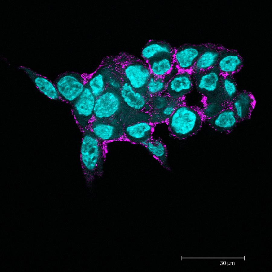 Overview Creator: Moon, Taylor Subject: Description:NIH 3t3 cells with nuclei in cyan and microtubule associated proteins in magenta Date Original:2012, April 4 Language:eng Rights Rights Management:Original materials may be protected by the Copyright Law of the United States (more information). Technical Digitization Specifications:Saved as JPEG (level 12) in Photoshop CS6 Date Digital:Mon, 02/02/2015 - 20:00 Format:image/jpeg Type:Image