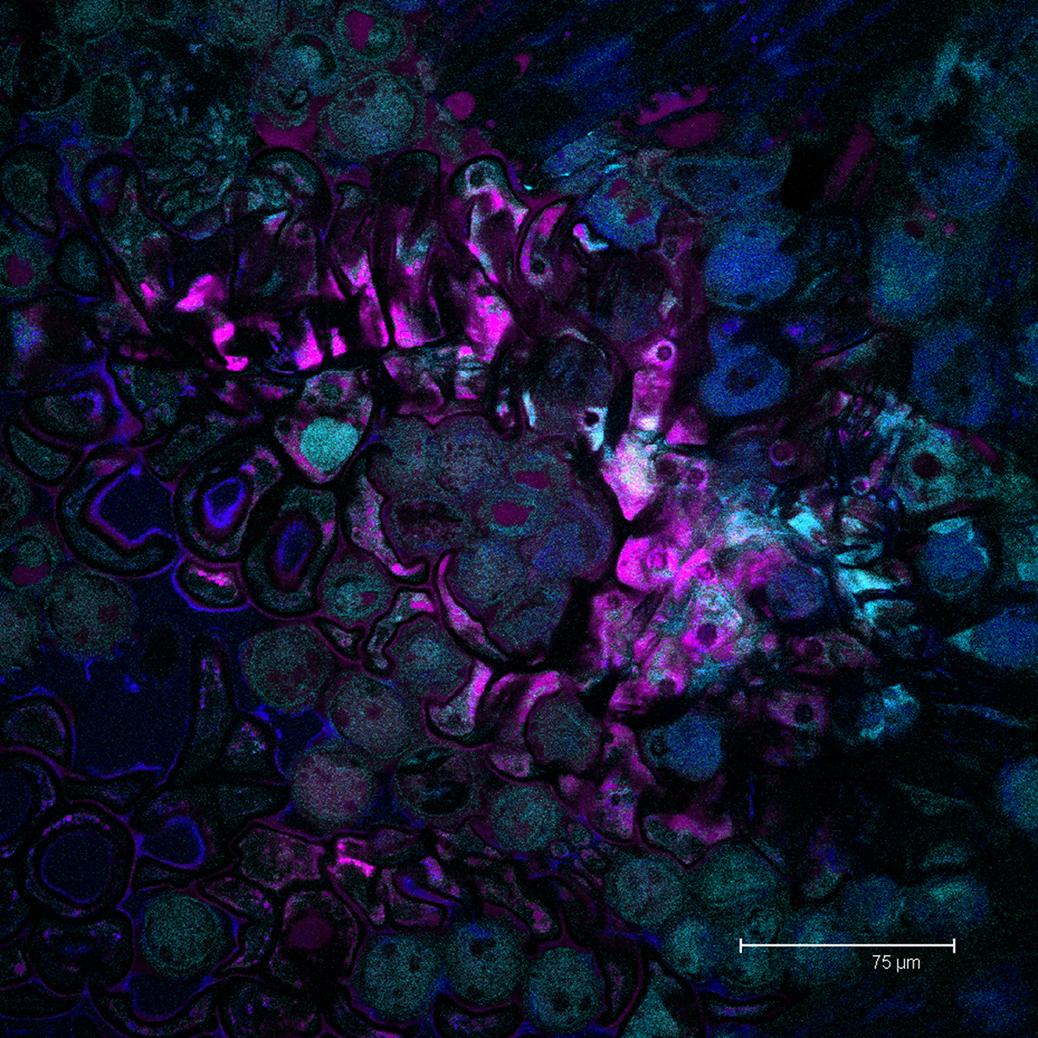 Overview Creator: Keever, William Subject: Description:Max image from pollen. Depth of section: 30.12 µm. Auto-fluorescent. Date Original:2012, April 5 Language:eng Rights Rights Management:Original materials may be protected by the Copyright Law of the United States (more information). Technical Digitization Specifications: Saved as JPEG (level 12) in Photoshop CS5. Date Digital:Tue, 10/30/2012 - 21:00 Format:image/jpeg Type:Image
