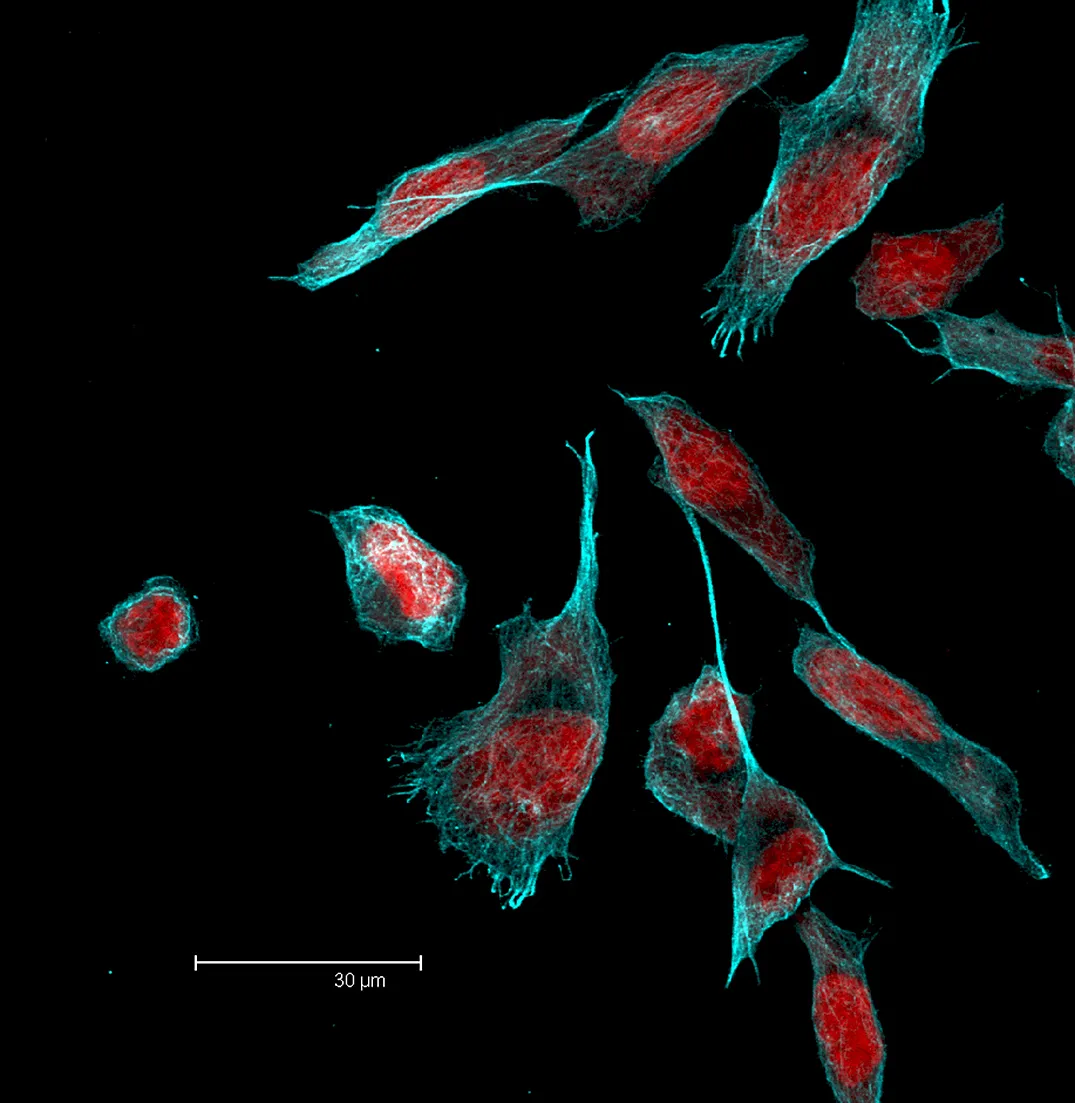 Overview Creator: Sokolowska, Izabela Subject: Description:PC3 cells; α-tubulin is shown in cyan, nuclei are shown in red; Maximum Image; Depth 5.13μm Date Original:2012, April 16 Language:eng Rights Rights Management:Original materials may be protected by the Copyright Law of the United States (more information). Technical Digitization Specifications:Saved as JPEG (level 12) in Photoshop CS6 Date Digital:Mon, 02/02/2015 - 20:00 Format:image/jpeg Type:Image
