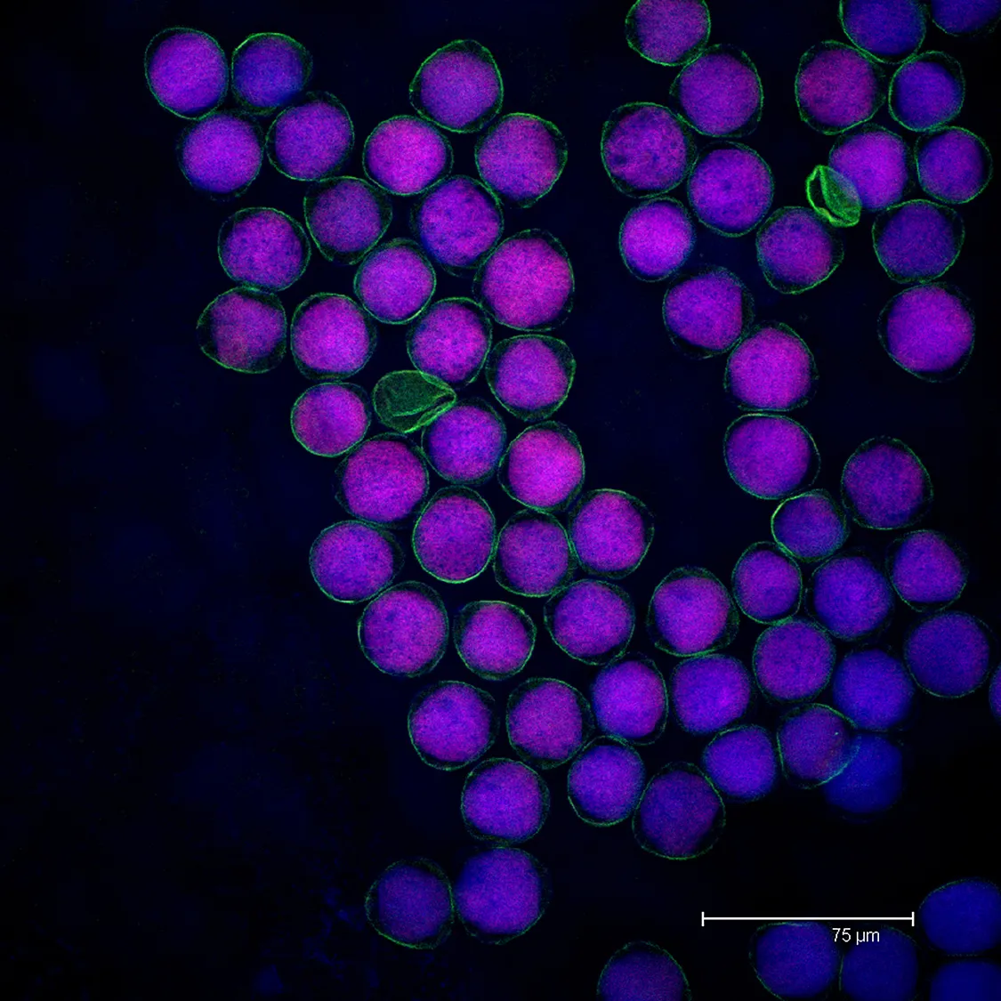 Portulaca flower petal (Portulaca amilis) imaged on 4/25/12. Cell wall in green and chloroplasts in purple. Average image. Depth of section is 22.79μm.