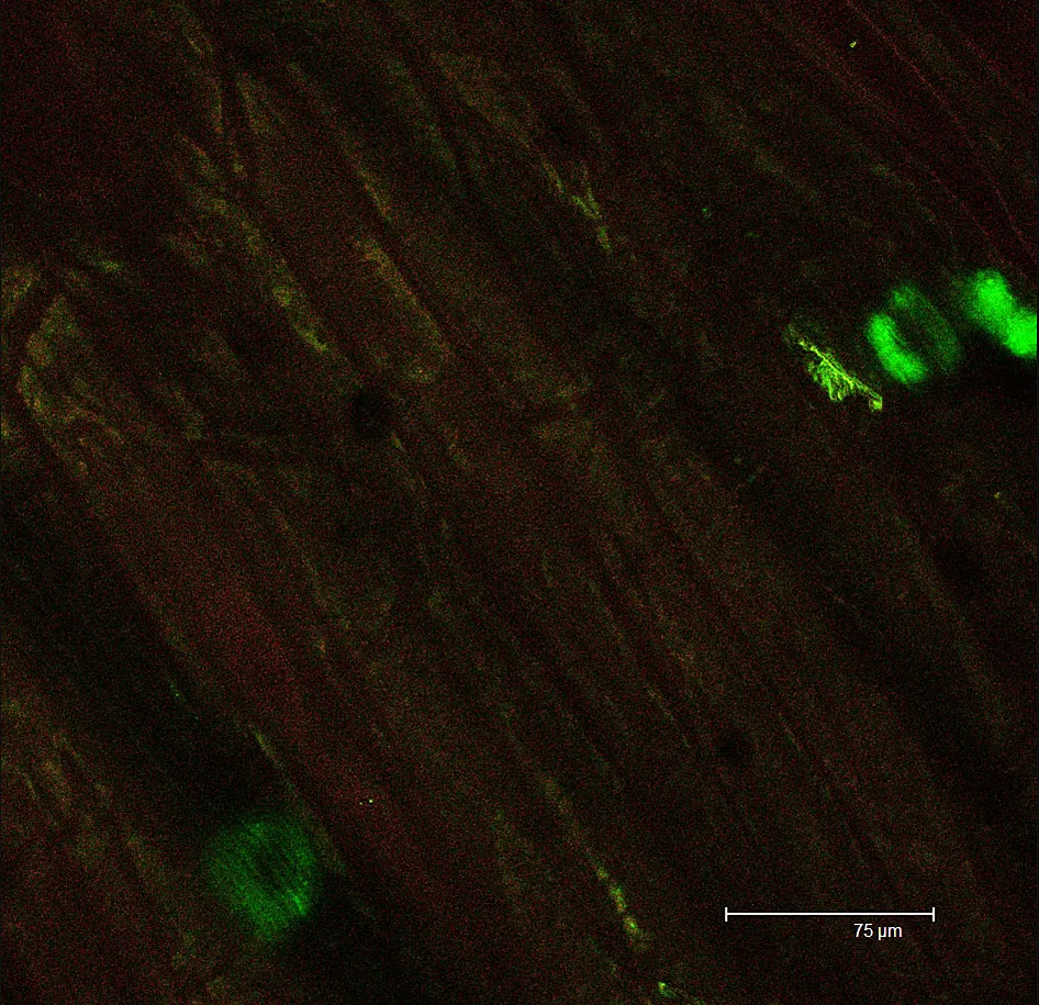 Overview Creator: Jones, Brenton Subject: Description:Single Scan Image of a Purple Tulip Petal (Tulipia) Stomata shown in green Date Original:2013, April 9 Language:eng Rights Rights Management:Original materials may be protected by the Copyright Law of the United States (more information). Technical Digitization Specifications:Saved as JPEG (level 12) in Photoshop CS6 Date Digital:Tue, 02/03/2015 - 20:00 Format:image/jpeg Type:Image