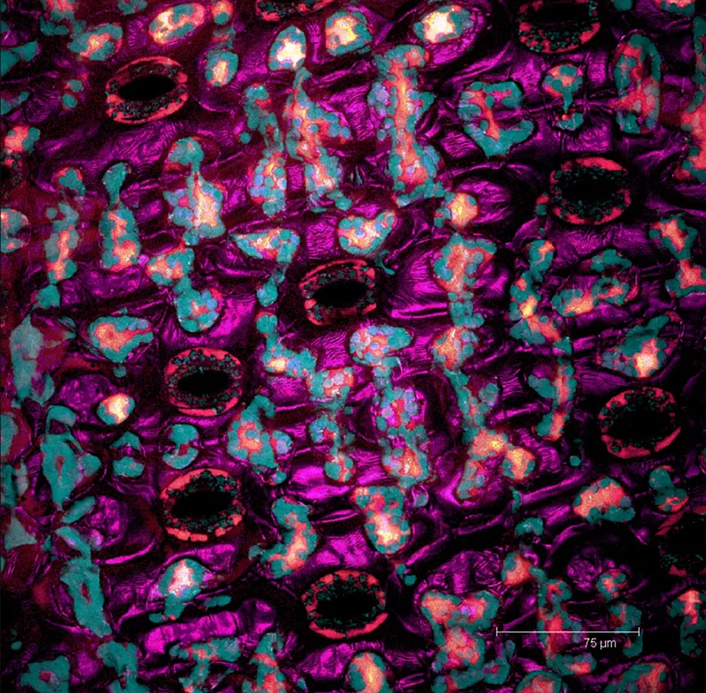 Overview Creator: LeValley, Kristy Subject: Description:Max image of a Queen Mum Agapanthus petal. Total depth 12.21um. Guard cells in glow, vascular bundle in cyan, epidermal layer in magenta Date Original:2013, April 10 Language:eng Rights Rights Management:Original materials may be protected by the Copyright Law of the United States (more information). Technical Digitization Specifications:Saved as JPEG (level 12) in Photoshop CS6 Date Digital:Wed, 02/04/2015 - 20:00 Format:image/jpeg Type:Image
