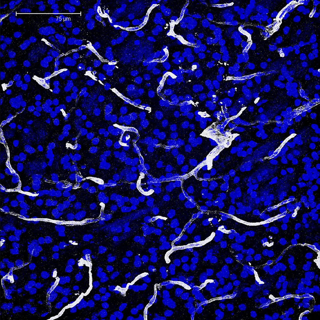 Overview Creator: Keith, Hollis Subject: Description:Rat brain, Transparent projection with a threshold of 37. Nuclei in blue. Vasculature in gray. Z depth: 35.41μm Date Original:2012, April 25 Language:eng Rights Rights Management:Original materials may be protected by the Copyright Law of the United States (more information). Technical Digitization Specifications:Saved as JPEG (level 12) in Photoshop CS6 Date Digital:Mon, 02/02/2015 - 20:00 Format:image/jpeg Type:Image