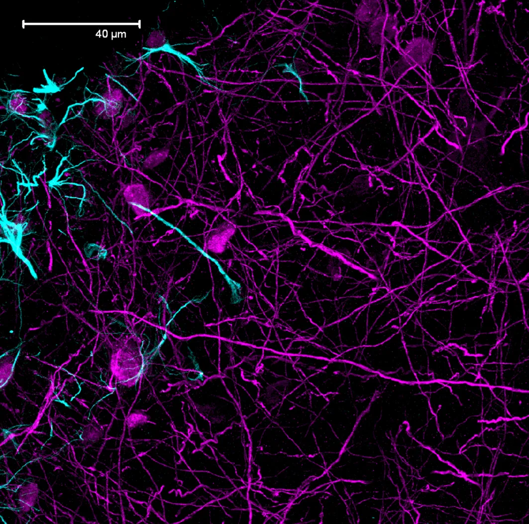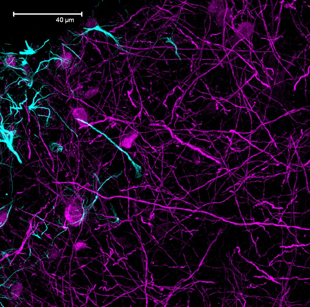 Overview Creator: Sokolowska, Izabela Subject: Description:Maximum image. Depth of section: 25.64μm. Glial fibrilliary acidic protein is shown in cyan and tumor differentiation factor protein is shown in magenta. Date Original:2012 April 9 Language:eng Rights Rights Management:Original materials may be protected by the Copyright Law of the United States (more information). Technical Digitization Specifications: Saved as JPEG (level 12) in Photoshop CS5. Date Digital:Tue, 10/30/2012 - 21:00 Format:image/jpeg Type:Image