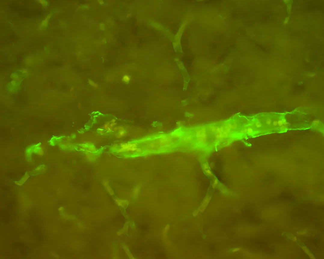 Overview Creator: Stoessel, Sean Subject: Description:Viewed under 40x objective on the fluorescence microscope. The vasculature is seen in green, glia in red, and red blood cells autofluoresce in yellow. Date Original:2011, November 11 Language:eng Rights Rights Management:Original materials may be protected by the Copyright Law of the United States (more information). Technical Digitization Specifications:Saved as JPEG (level 12) in Photoshop CS5 with Unsharp Mask of 60:1. Date Digital:Thu, 02/02/2012 - 20:00 Format:image/jpeg Type:Image