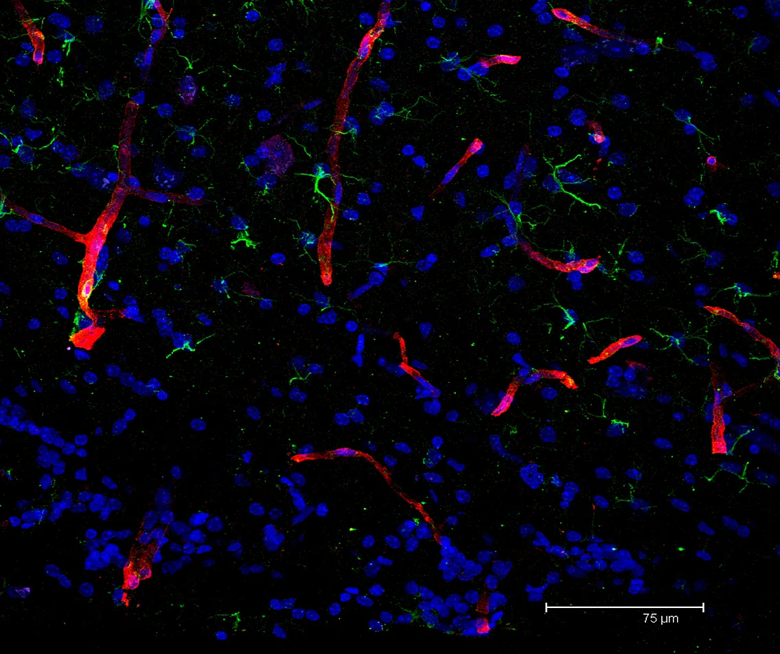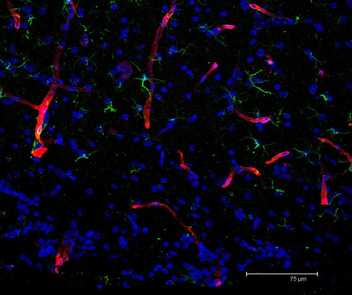 Overview Creator: Langsdale, Hannah Subject: Description:Maximum projection of a rat brain section. Nuclei shown in blue. Vasculature shown in red. Glial associated proteins shown in green. Total depth of section = 23.61µm Date Original:2013, May 1 Language:eng Rights Rights Management:Original materials may be protected by the Copyright Law of the United States (more information). Technical Digitization Specifications:Saved as JPEG (level 12) in Photoshop CS6 Date Digital:Tue, 02/03/2015 - 20:00 Format:image/jpeg Type:Image