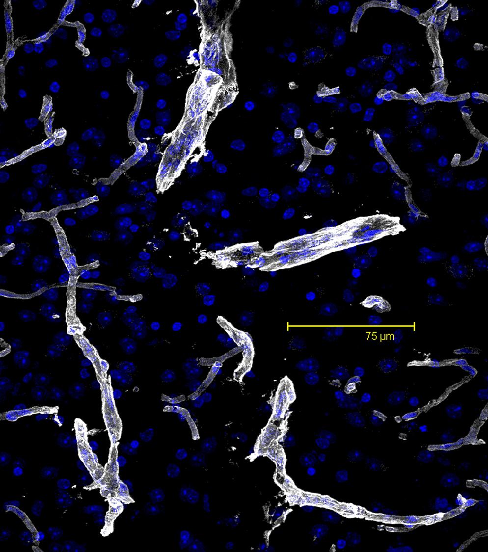 Maximum Projection. Depth of section: 24.42μm. Blood vessels are in grey. Nuclei are in blue.
