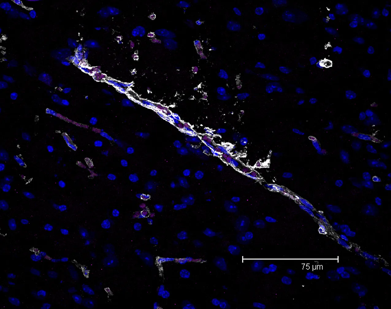 Max projection. Depth of section: 8.18 µm. Laminin is in grey, β III Tubulin is in purple, and nuclei are in blue.
