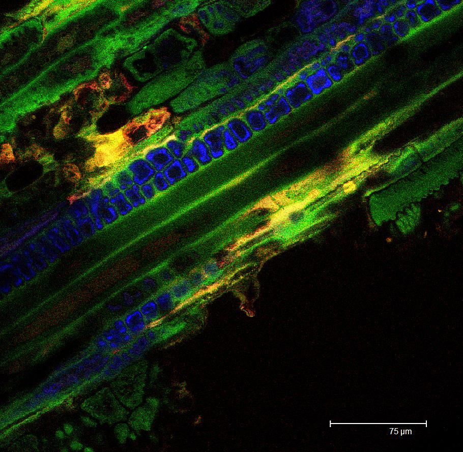 Overview Creator: Stoessel, Sean Subject: Description:Maximum projection. Section depth: 127.40μm. Both green and blue chlorophyll can be seen. Terpenes are shown in red. 11/11/11 Date Original:2011, November 11 Language:eng Rights Rights Management:Original materials may be protected by the Copyright Law of the United States (more information). Technical Digitization Specifications:Saved as JPEG (level 12) in Photoshop CS5 with Unsharp Mask of 60:1. Date Digital:Tue, 01/24/2012 - 20:00 Format:image/jpeg Type:Image