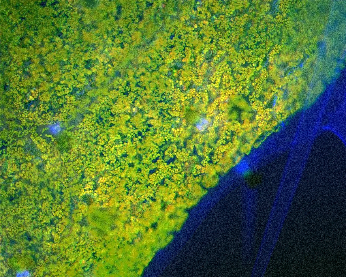 Overview Creator: Studlack, Paige Subject: Description:Composite image of an autofluorescent red spruce needle (Picea rubens), visualized under the 20X objective. Chlorophyll in red and green, and cuticle in blue. Date Original:2013, April 1 Language:eng Rights Rights Management:Original materials may be protected by the Copyright Law of the United States (more information). Technical Digitization Specifications:Saved as JPEG (level 12) in Photoshop CS6 Date Digital:Thu, 02/05/2015 - 20:00 Format:image/jpeg Type:Image