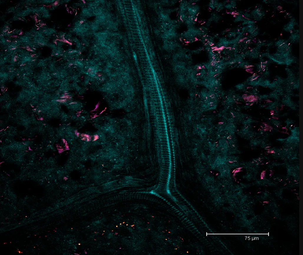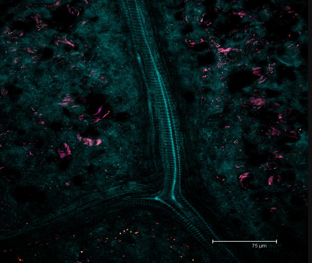 Overview Creator: LeValley, Kristy Subject: Description:Average image of a Rosa xanthina (Yellow rose) petal. Total depth of 6.11um. Phloem in cyan, epidermal cells in magenta, chloroplast in glow Date Original:2013, April 29 Language:eng Rights Rights Management:Original materials may be protected by the Copyright Law of the United States (more information). Technical Digitization Specifications:Saved as JPEG (level 12) in Photoshop CS6 Date Digital:Wed, 02/04/2015 - 20:00 Format:image/jpeg Type:Image