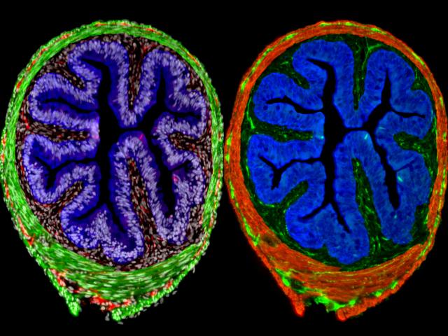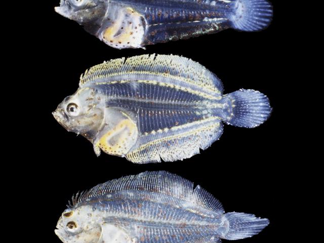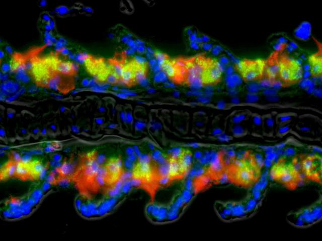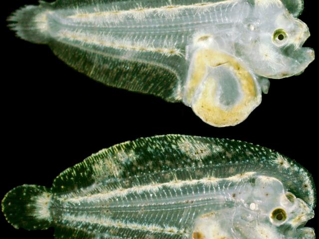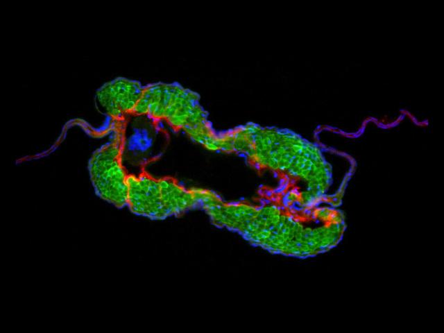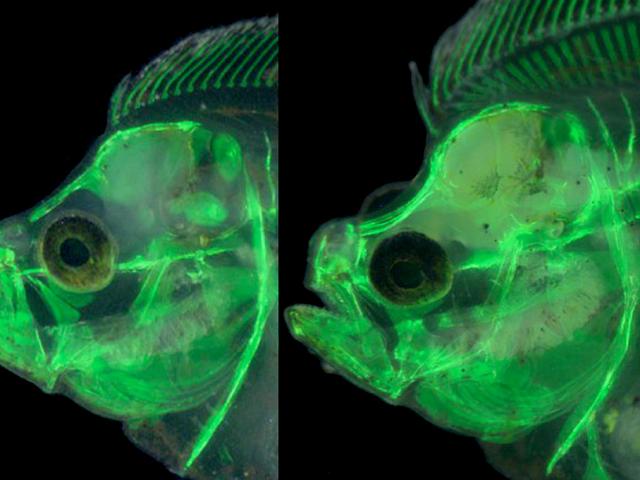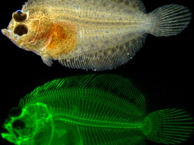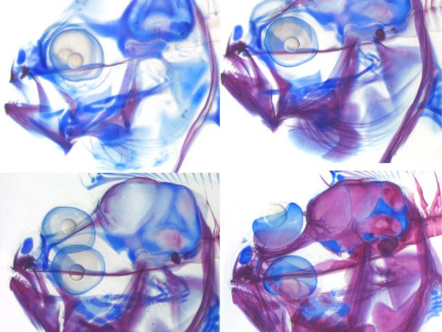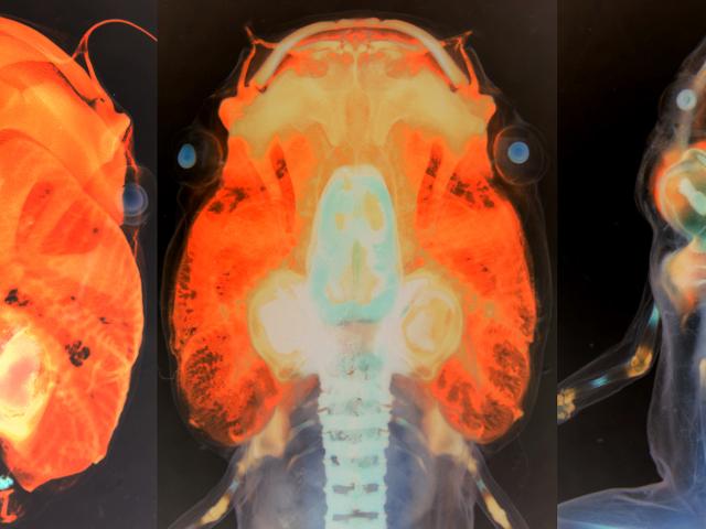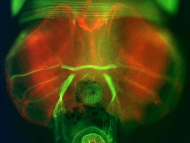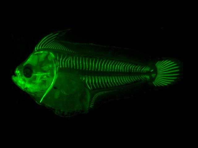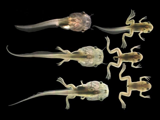 Assistant professor of biology Alex Schreiber, a developmental biologist who is fascinated by vertebrate metamorphosis, uses fluorescence and bright-field and dark-field light microscopy to photograph organisms stained with tissue-specific dyes. With digital imaging software, Schreiber brings still images to life by morphing different developmental stages of larvae into one seamless transformation.