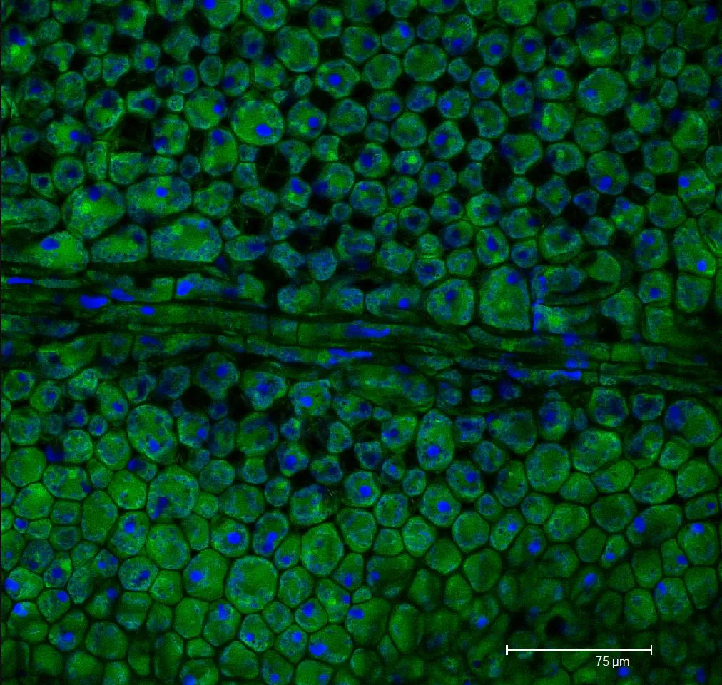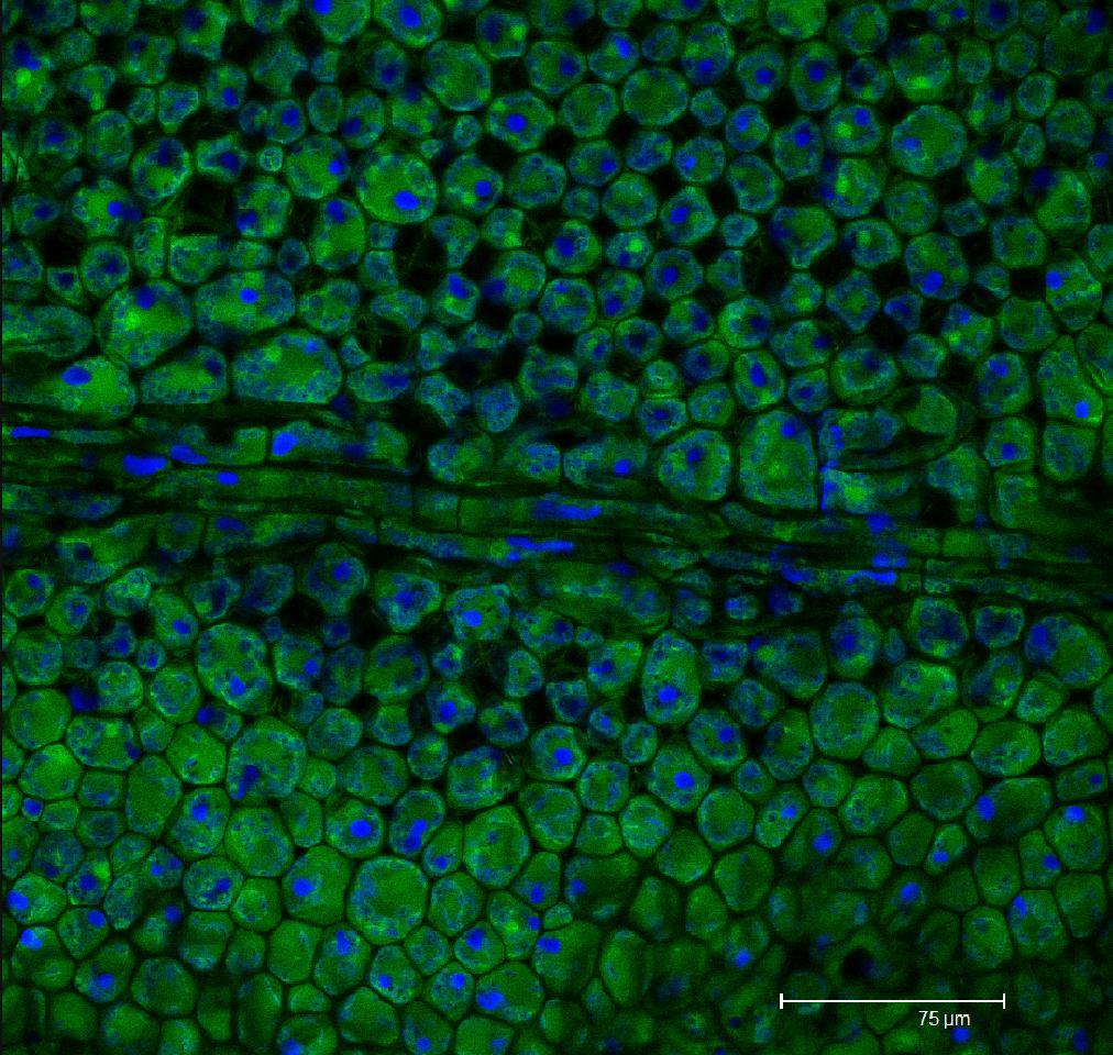 Overview Creator: Schwallie, Ryan Subject: Description:Series scan image of Hydrangea macrophylla leaf. Vascular bundle depicted in the center, cuticle wax depicted in blue, epithelial cells depicted in green. Date Original:2014, October 24 Language:eng Rights Rights Management:Original materials may be protected by the Copyright Law of the United States (more information). Technical Digitization Specifications:Saved as JPEG (level 12) in Photoshop CS6 Date Digital:Wed, 01/28/2015 - 20:00 Format:image/jpeg Type:Image