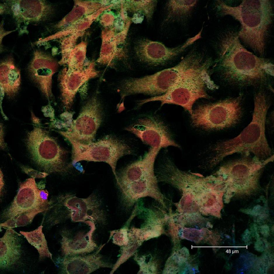 Overview Creator: Schwallie, Ryan Subject: Description:Single scan image of B16 cells. Nuclei in red, F-actin in green. Date Original:2014, October 31 Language:eng Rights Rights Management:Original materials may be protected by the Copyright Law of the United States (more information). Technical Digitization Specifications:Saved as JPEG (level 12) in Photoshop CS6 Date Digital:Wed, 01/28/2015 - 20:00 Format:image/jpeg Type:Image