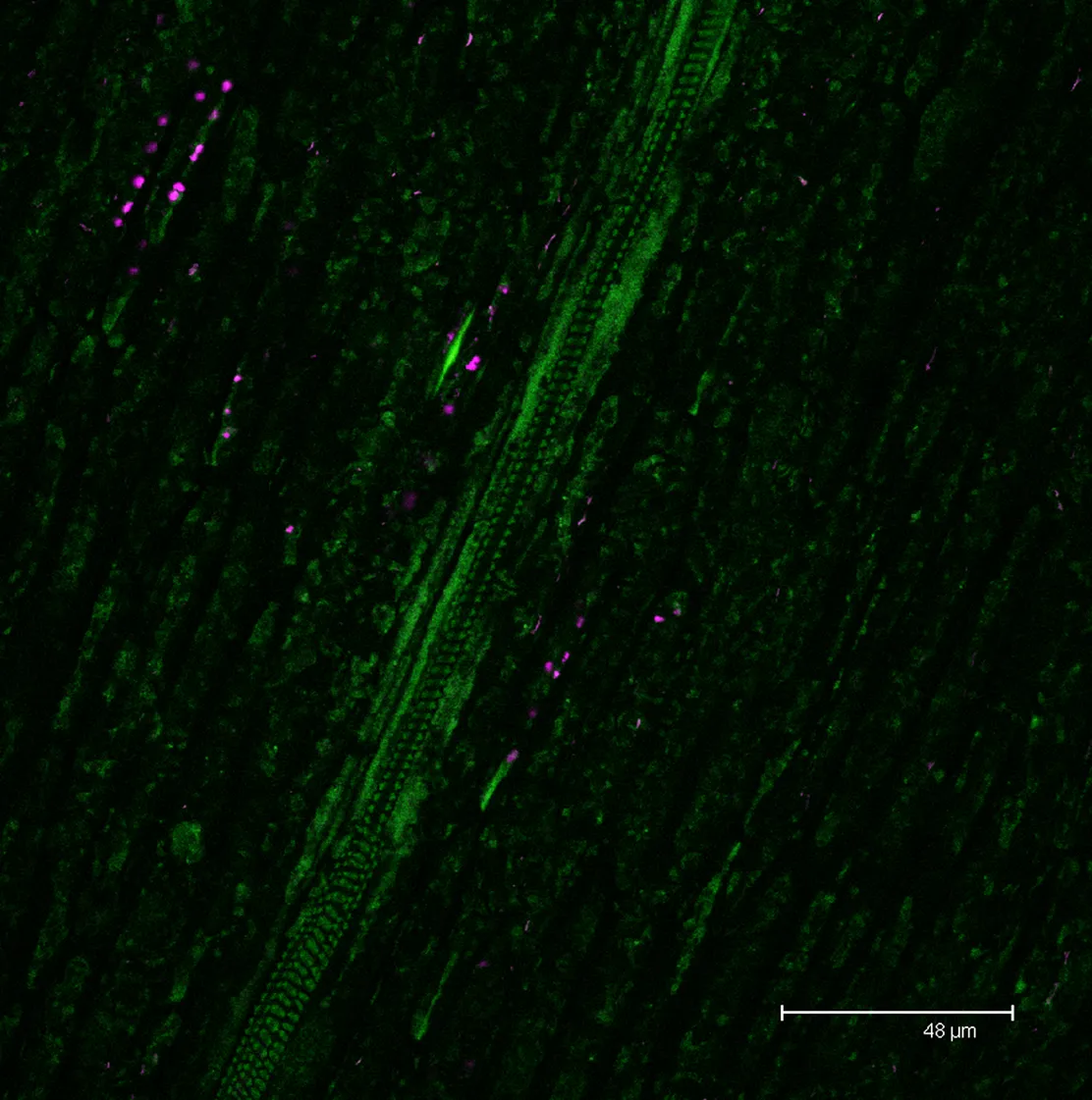 Overview Creator: Morra, Adriana Subject: Description:Single scan image of Symphyotrichum pilosum “frost aster” petal. Vasculature and epidermal cells are shown in green and magenta. Date Original:2014, December 4 Language:eng Rights Rights Management:Original materials may be protected by the Copyright Law of the United States (more information). Technical Digitization Specifications:Saved as JPEG (level 12) in Photoshop CS6 Date Digital:Tue, 01/27/2015 - 20:00 Format:image/jpeg Type:Image