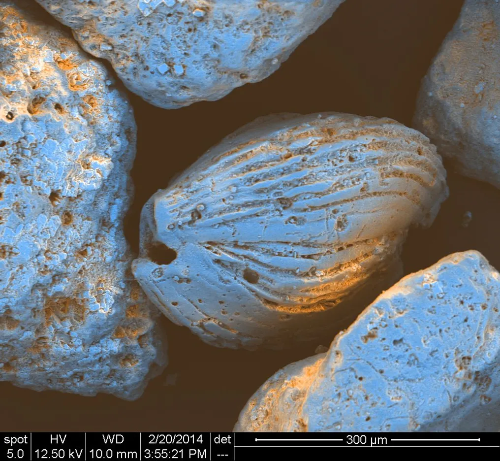 Striated sand grain from Vanuata, South Pacific, Mixed image, Mag: 222x